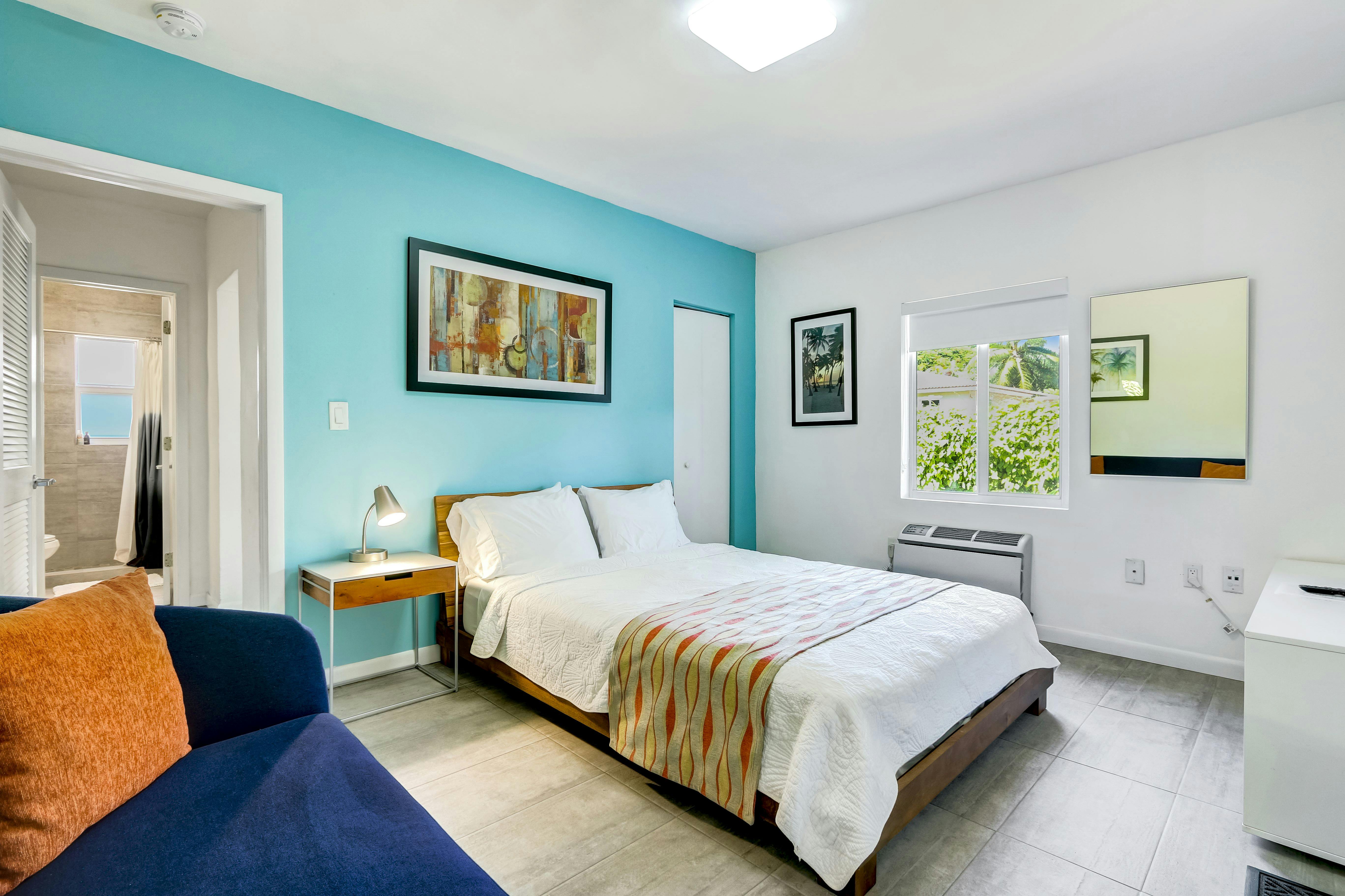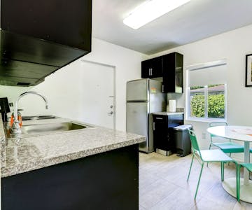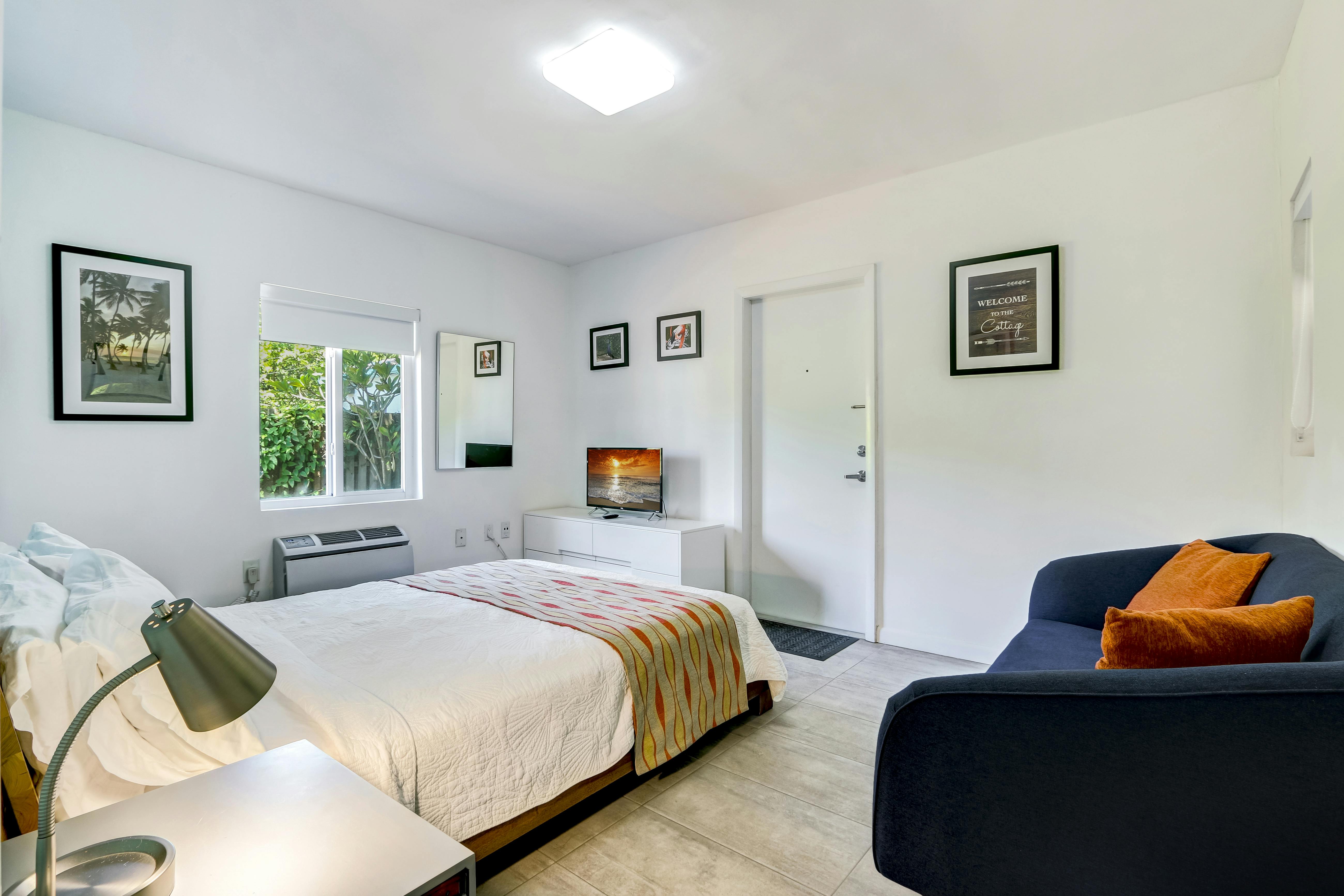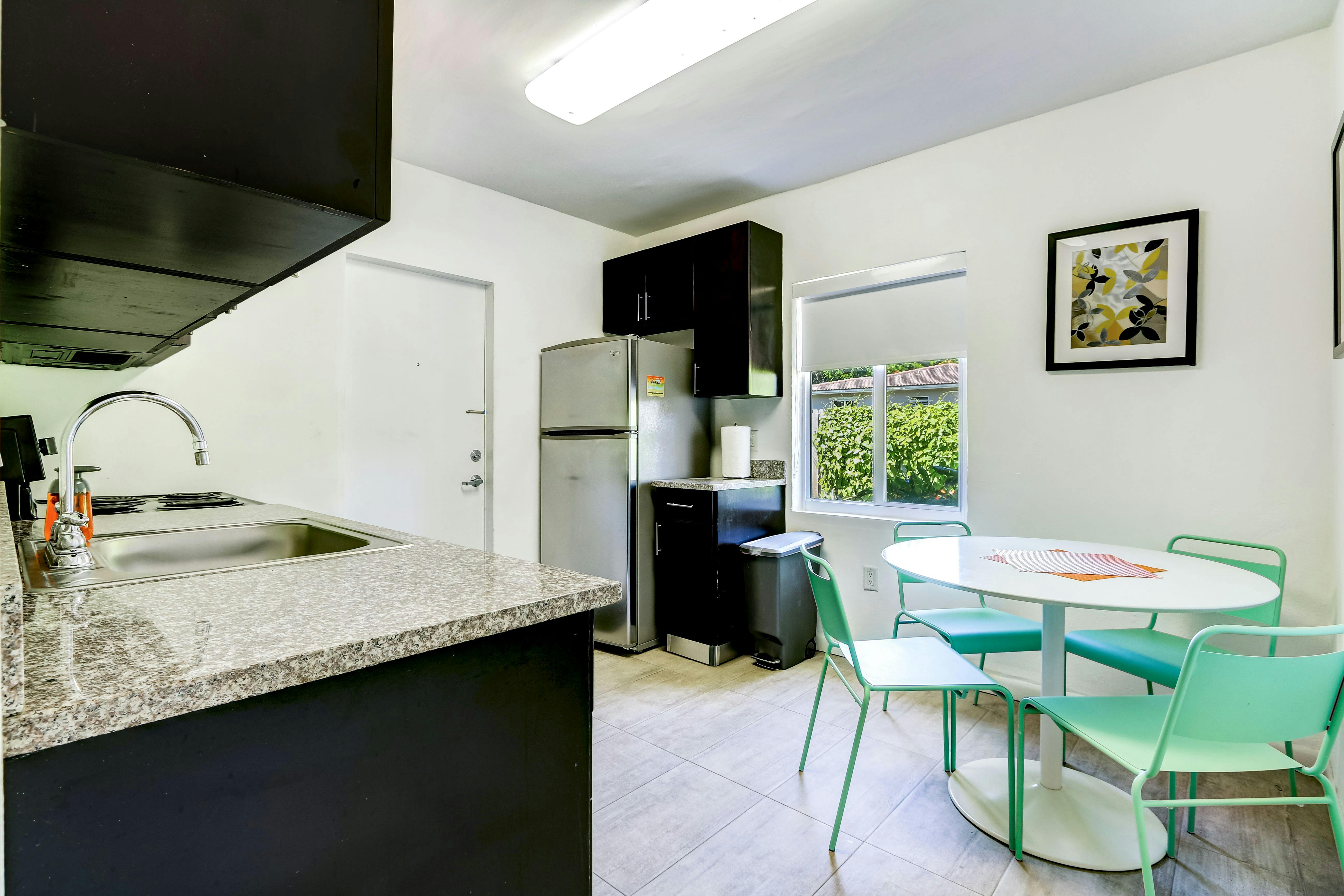 Cottages El Portal is a boutique community of fully furnished apartments near Wynwood, Miami Beach and Downtown Miami. Old Florida architecture on an acre of lush landscaping in a residential neighborhood. Brick patios, sun gardens, covered porches and a courtyard provide a resort environment. Guest and visitor parking, laundry facilities, gated access and ground floor private entry doors. The Cottages feature granite countertops, wood cabinets and stainless appliances, along with CB2 furniture and Sealy Mattresses.